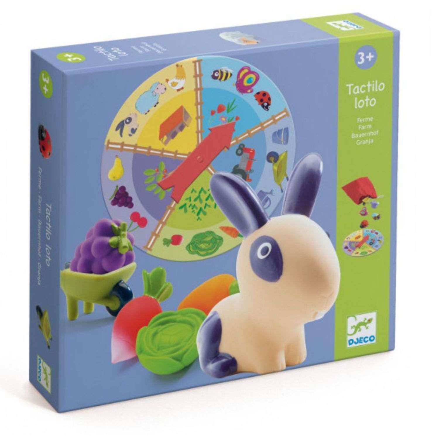 Djeco Senzorični loto – Na kmetiji je čudovita didaktična igra, ki spodbuja čut za tip in opazovanje. Otroci s tipanjem prepoznavajo različne teksture in jih povezujejo s podobami živali in predmetov s kmetije.